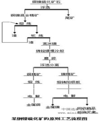 处理硫化铜镍矿,一般采用选矿、熔炼和吹炼获得高冰镍,然后再用浮选法使铜镍分离,铜、镍精矿再分别送冶炼产出金属铜和金属镍,在冶炼过程中综合回收钴和铂族元素,某铜镍硫化矿的原则工艺流程如下:详见流程图: